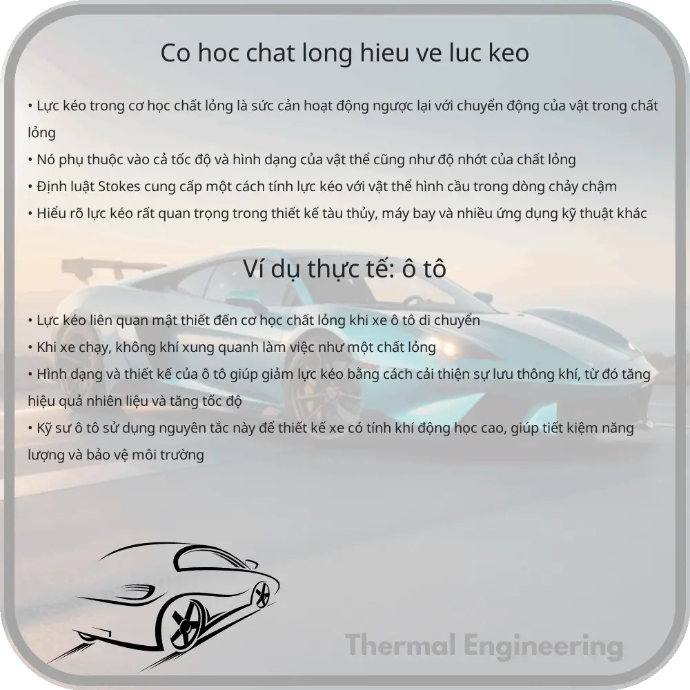 Cơ học chất lỏng là một nhánh quan trọng của kỹ thuật nhiệt, gồm việc nghiên cứu hành vi của chất lỏng và khí trong các điều kiện khác nhau. Một phần quan trọng của cơ học chất lỏng là lực kéo, lực tác động lên một vật khi nó di chuyển qua chất lỏng. Hiểu về lực kéo không chỉ cần thiết cho các kỹ sư mà còn có ứng dụng rộng rãi trong nhiều lĩnh vực khác.
